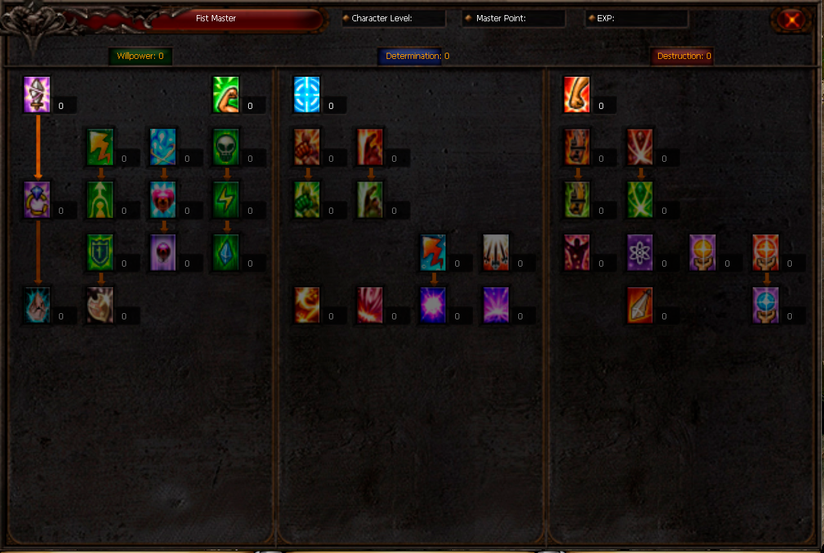 Like the other characters, the Rage Fighter has his Master Skill Tree, which can be unlocked after class evolution with NPC Apostle Devin, in Crywolf, upon reaching level 400 (Master).