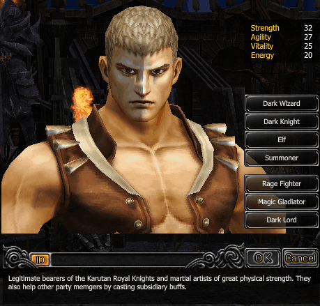 With an arsenal of devastating abilities, the Rage Fighter is capable of dealing massive damage to enemies, while protecting his allies with powerful defensive techniques. He has his own equipment, especially exclusive gloves that function as weapons. He does not use gloves from other classes like the BK, as he has built-in weaponry.