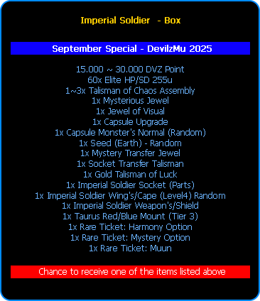 With great enthusiasm, we introduce new equipment in DevilzMu, available in Normal versions (equipment) and for Visual conversion. We welcome: Imperial Soldier Kit.